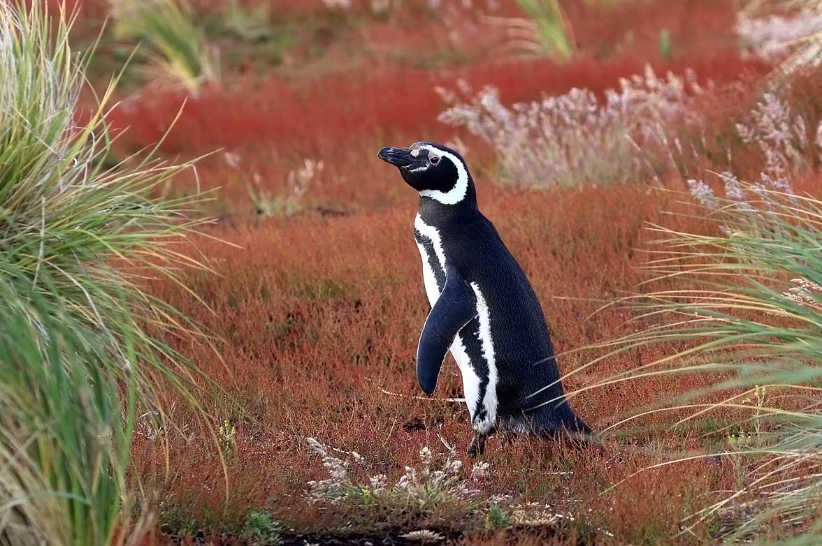 Maghelhaenpinguïn 19 juli 2021 1176 × 782 Maghelhaenpinguïn Kleurige Magelhaenpinguïn Het zwartwitte verenkleed van een Magelhaenpinguïn contrasteert met de rode kleur van de vegetatie op de achtergrond. Carcass Island, West Falkland.