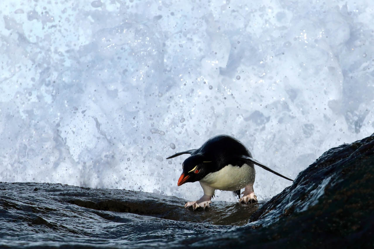 Het is gelukt! Een rotspinguïn kruipt de spekgladde rotswand op. Met behulp van zijn krachtige tenen (met stevige) nagels) werkt het dier zich omhoog, waarbij ze niet zelden weer de kolkende zee in worden geslagen. Sea Lion Island, South East Falkland.