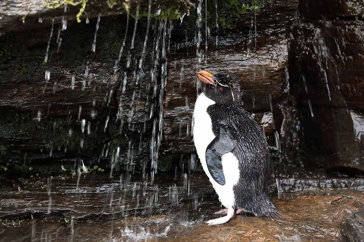 Een wereldberoemd tafereel,. Op Saunders Island, nemen Zuidelijke rotspinguïns een bad. Het is regenwater, dat in kleine stroompjes vanaf heuvels omlaag stroomt. In spleten en gaten ontstaat dan een straal zoet water, waarmee rotspinguïns zichzelf afspoelen. De BBC verwerkte dit tafereel ook in de vele natuurdocumentaires. Saunders Island, West Falkland.