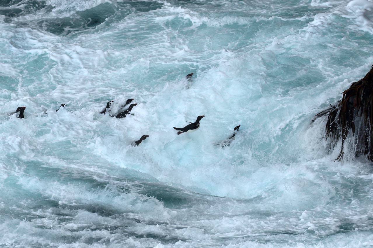Op de Falkland Eilanden, broeden veel Zuidelijke rotspinguïns. Ze broeden ook op Sea Lion Island. Na verloop van tijd keren de rotspinguïns terug naar hun jongen, maar…daar moeten zij wel wat voor doen. Als het hard waait beuken de golven met oorverdovende kracht op de loodrechte rotswanden. In die bruisende heksenketel moeten de rotspinguïns aan land zien te komen. Hoe die vogels daarin slagen is en blijft onvoorstelbaar. Rotspinguïns zijn echte helden! Sea Lion Island, South East Falkland.